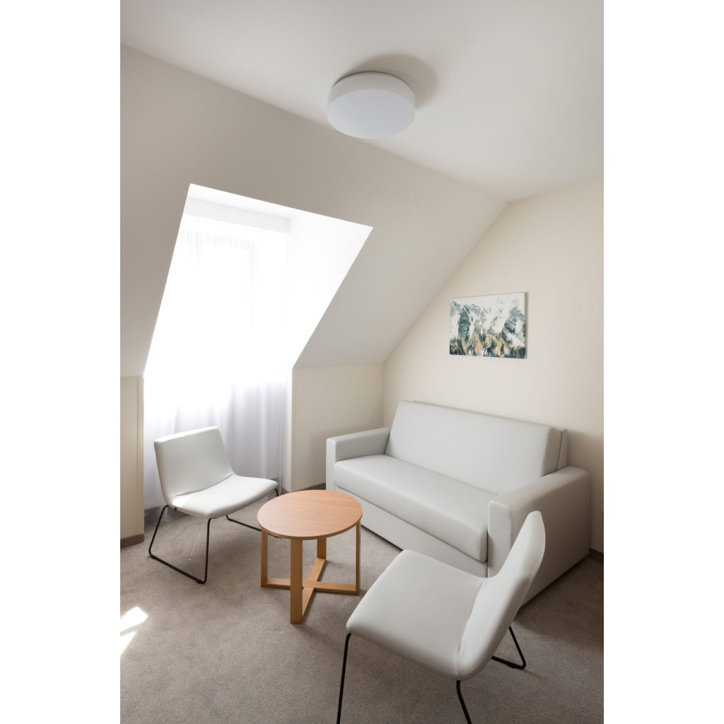 ELSA 4 je LED svítidlo s průměrem 420 mm a výškou 90 mm ze série svítidel ELSA. Jak je u svítidel české značky Osmont obvyklé, tak i ELSA 4 zaujme především ručně vyráběným třívrstvým skleněným stínidlem TRIPLEX OPAL s matovaným povrchem. Tento typ svítidla ELSA 4 disponuje integrovaným pohybovým vysokofrekvenčním senzorem. Můžete si vybrat variantu s příkonem 17 W nebo 24 W. Stínidlo je k bíle lakované ocelové základně uchyceno bajonetovým systémem. Svítidlo je vybavené 2CCT přepínačem, kterým si můžete nastavit barevnou teplotu světla 3000 K nebo 4000 K. Stupeň krytí IP44 poskytuje zvýšenou ochranu proti vniknutí vody nebo nečistot.