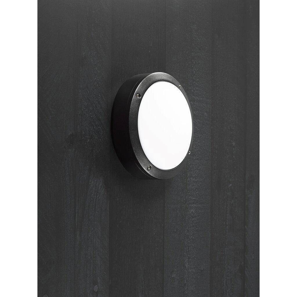 Stropní svítidlo NORDLUX Desi s kulatou hliníkovou základnou se stínítkem z odolného polykarbonátu, v černé barvě a několika velikostech. Vzhledem k vyššímu krytí IP44 je vhodné k umístění ven na dům, nebo na strop i zeď do koupelny. Žárovka je vyměnitelná, můžete tak zakoupit LED žárovku, dokonce s možností stmívání, kterou můžete ovládat přes svůj mobilní telefon. Pozor, do většího svítidla je potřeba zakoupit 2 žárovky.